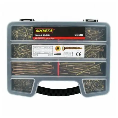Mallette de 800 Vis à bois TORX de la gamme professionnelle selon dimensions choisies en Acier Bichromatées avec tête fraisée, Filetage Partiel, Moletage et Pointe Anti-Fendage.