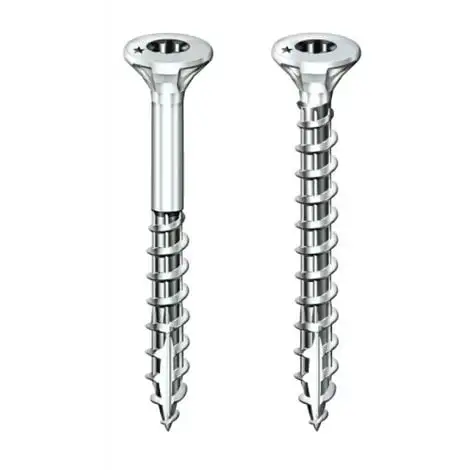 Vis à bois aggloméré acier tête fraiséeVis à bois aggloméré tête fraisée empreinte Torx acier zingué partiellement filetées Rocket Acier zingué blanc sans chrome 6.4 cavités sous tête : fraisage du bois et meilleur contact avec le métal.Triple cône : meilleure pénétration, haute résistance à la rupture.6 stries en